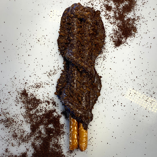 Our Dark Caramel Coffee Pretzel aka as Mocha Caramel Latte is one of our favorites at Sarah's Gourmet Pretzels. This gourmet delight's delectable combination of crushed coffee beans, dark chocolate, caramel, and pretzel is sure to captivate your taste buds. Enjoy the ultimate pleasure of the Dark Caramel Coffee Pretzel Latte today.